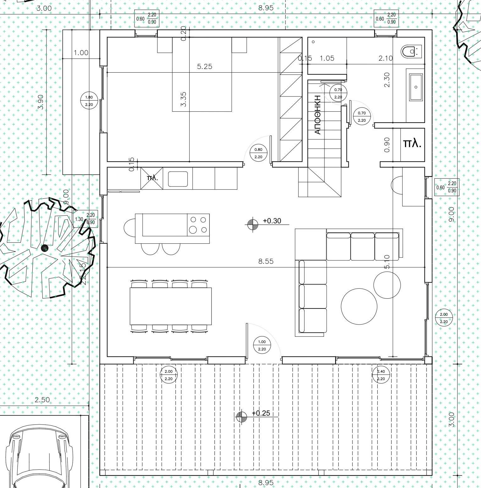Κατοικία διαμορφωμένη σε δύο επίπεδα με ένα υπνοδωμάτιο και ένα λουτρό σε κάθε επίπεδο, δημιουργώντας έτσι ιδιωτικές ζώνες εντός της κατοικίας. Αντίθετα στον ισόγειο ενιαίο χώρο καθιστικό/τραπεζαρία/κουζίνα, οι μεγάλες τζαμαρίες δεν οριοθετούν εσωτερικό και εξωτερικό χώρο.