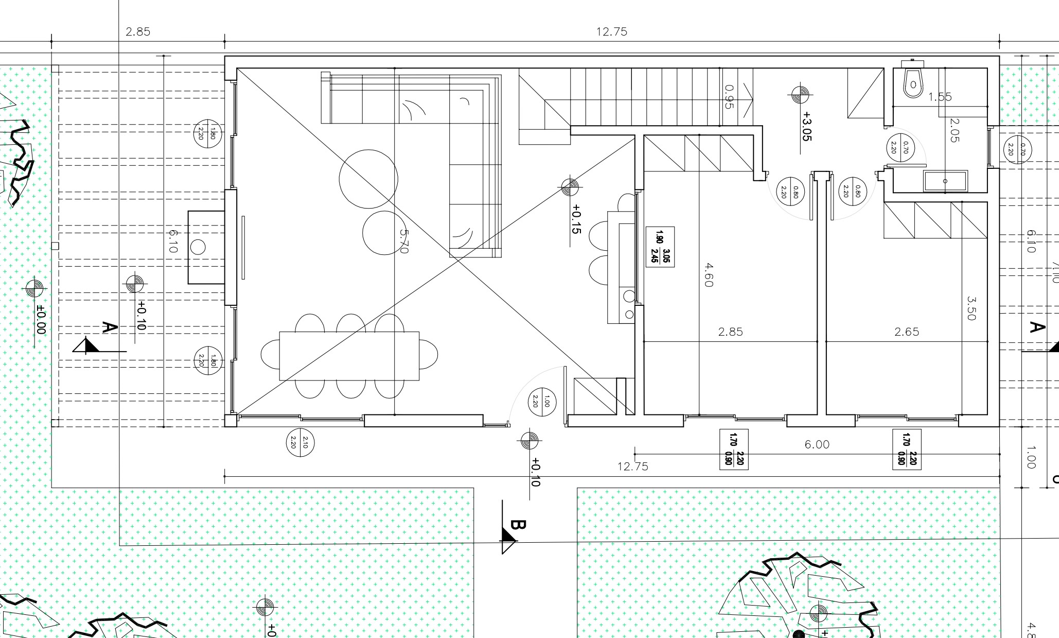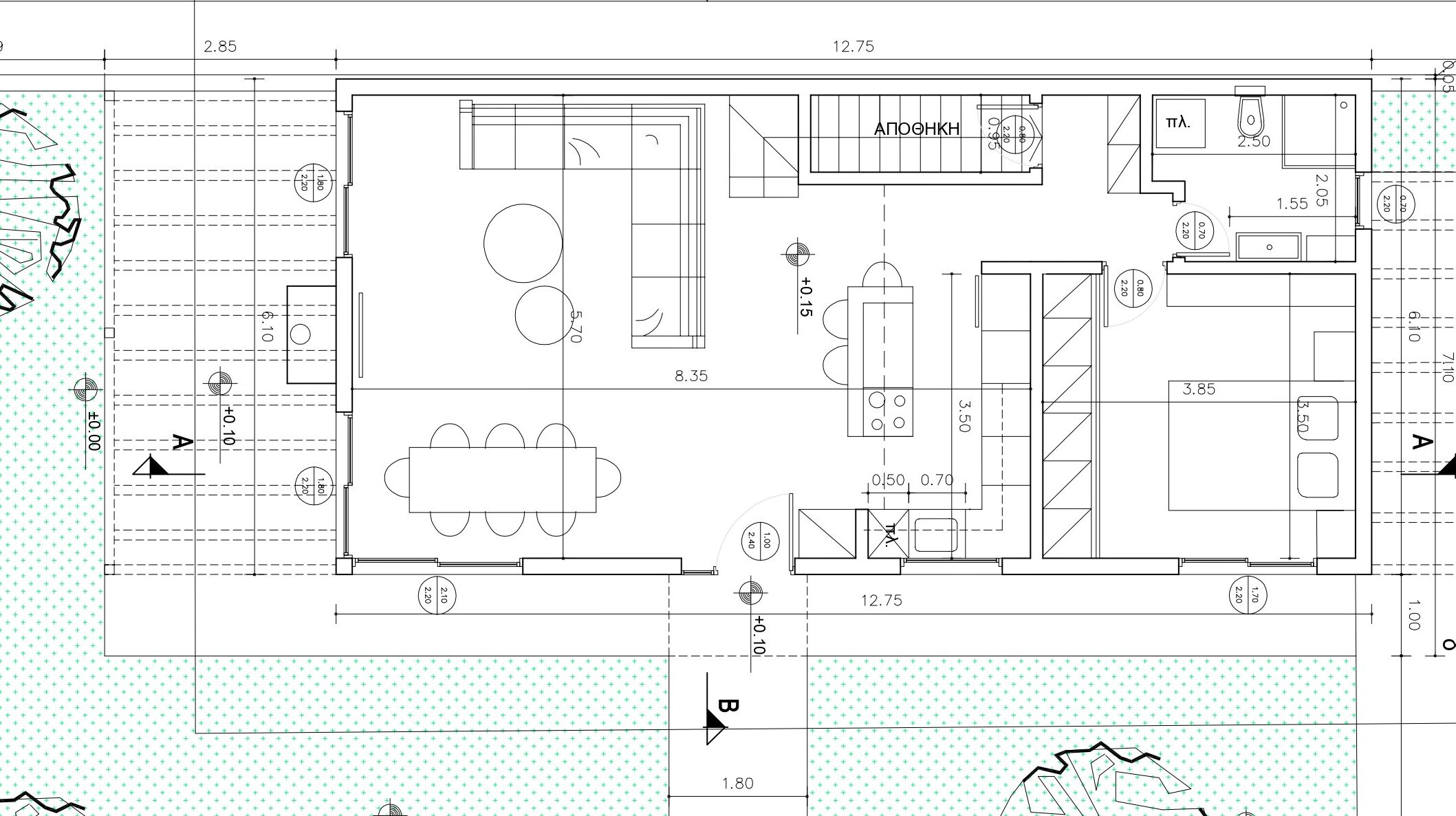 Η κατοικία αυτή αποτελείται από δύο όγκους, έναν ισόγειο όπου βρίσκεται το καθιστικό με τη θεαματική κλίση της μονόριχτης μοντέρνας στέγης και έναν διώροφης κατασκευής για τα υπνοδωμάτια και τα λουτρά, ισογείου και σοφίτας.