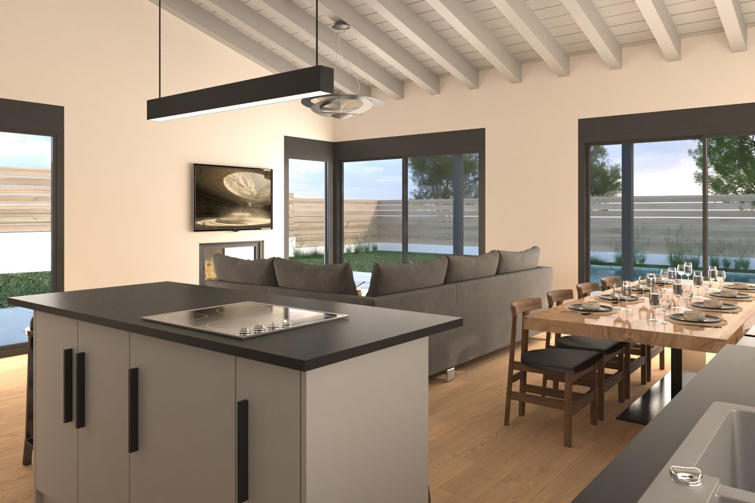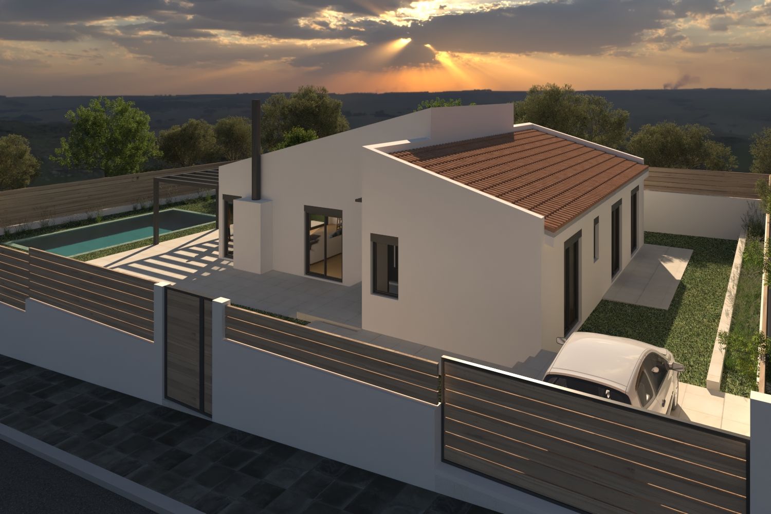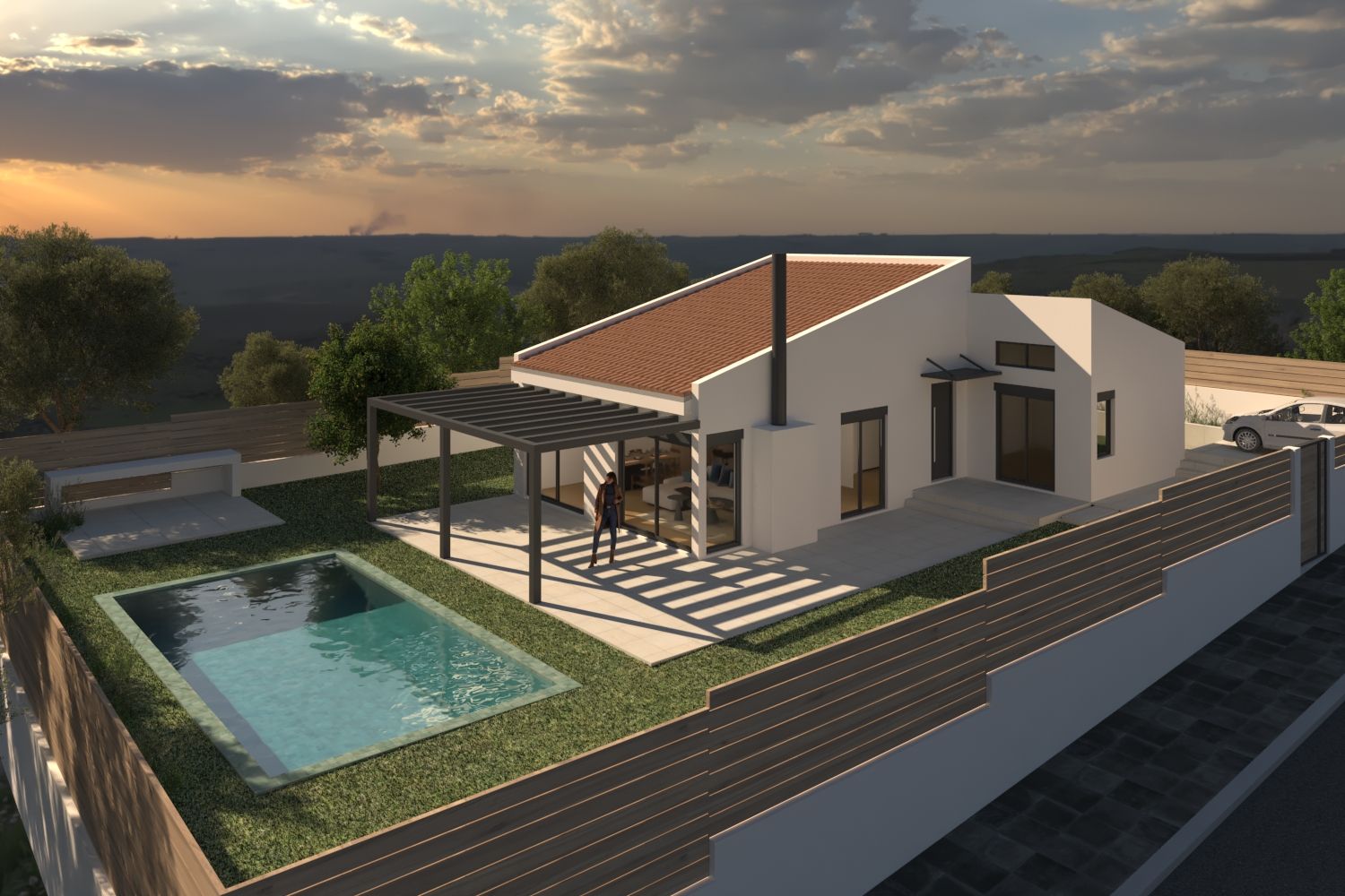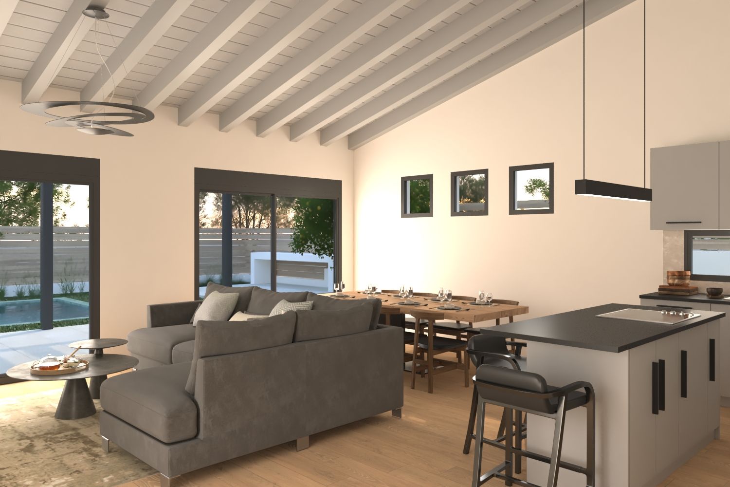 Η κατοικία αποτελείται από έναν ενιαίο χώρο διημέρευσης που περιλαμβάνει καθιστικό/τραπεζαρία/ κουζίνα, τρία υπνοδωμάτια καθώς και δύο λουτρά. Το ζητούμενο του σχεδιασμού ήταν η ανάγκη για τη δημιουργία “ανοιχτών” εσωτερικών χώρων, με την έννοια της διαμπερότητας, για να υπάρχει άμεση πρόσβαση και οπτική επαφή με τον περιβάλλοντα χώρο του κήπου και της πισίνας. Όσον αφορά στον εσωτερικό σχεδιασμό της κατοικίας, σκοπός του σχεδιασμού ήταν η δημιουργία λιτών, άνετων και ζεστών χώρων.