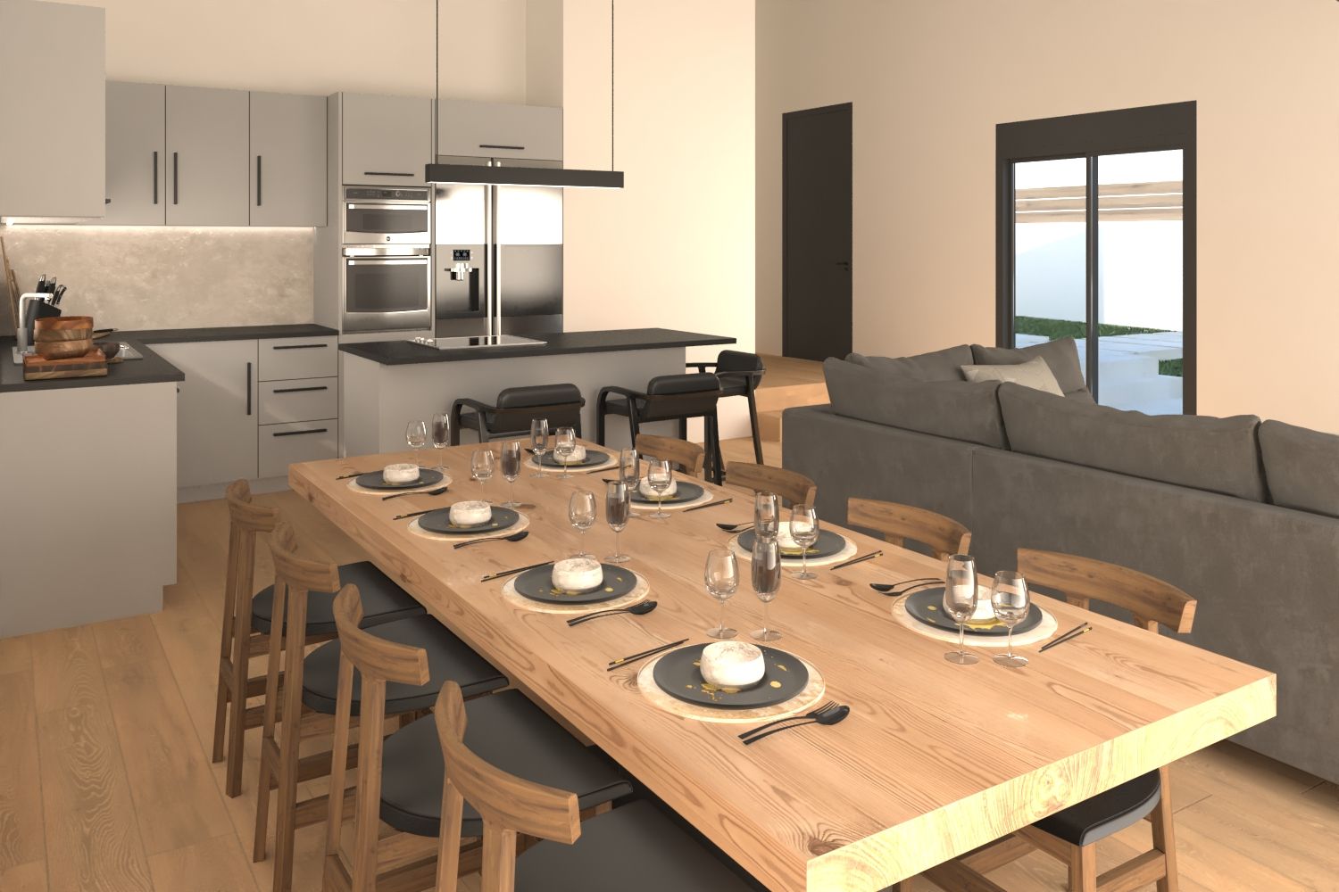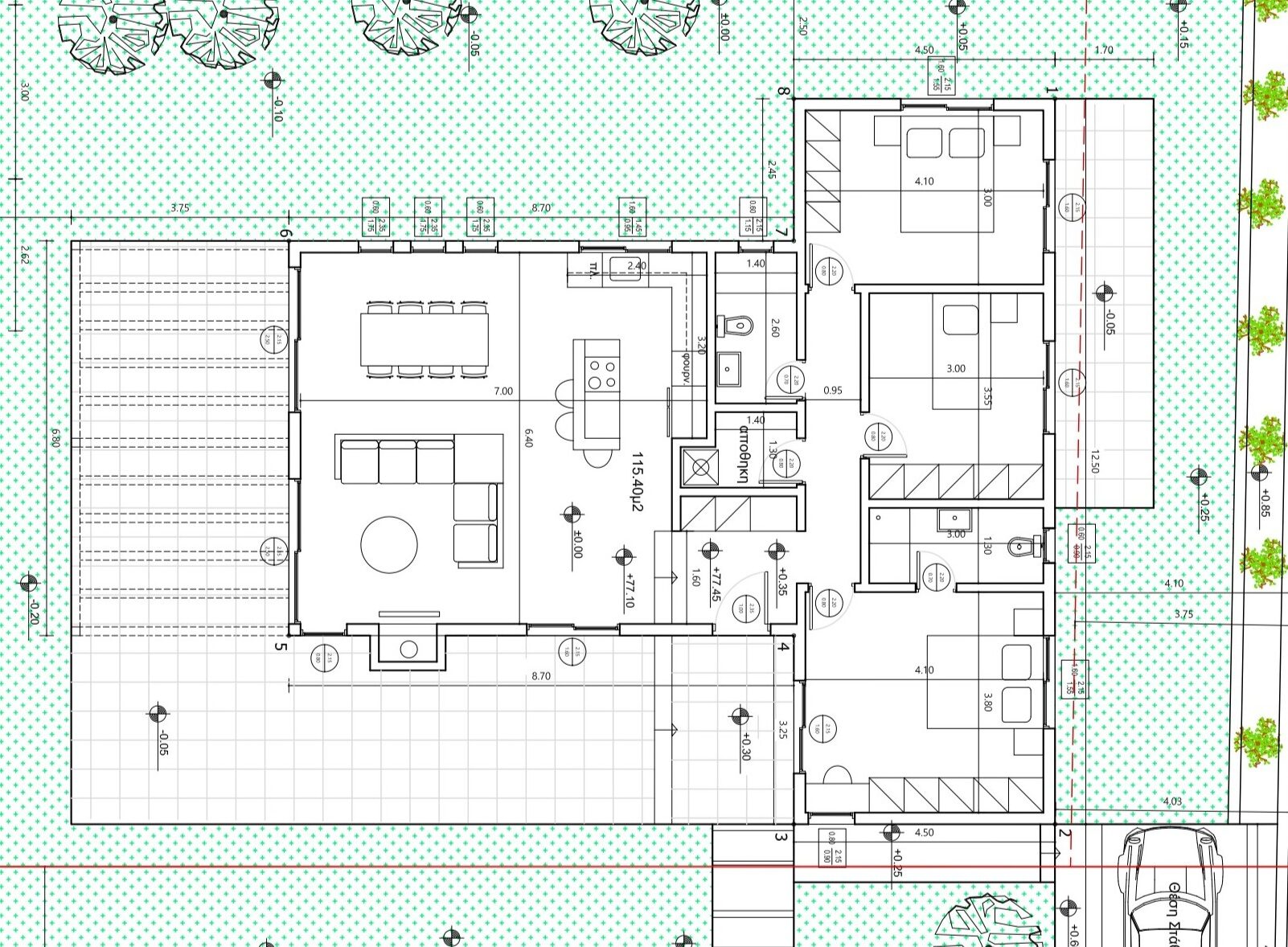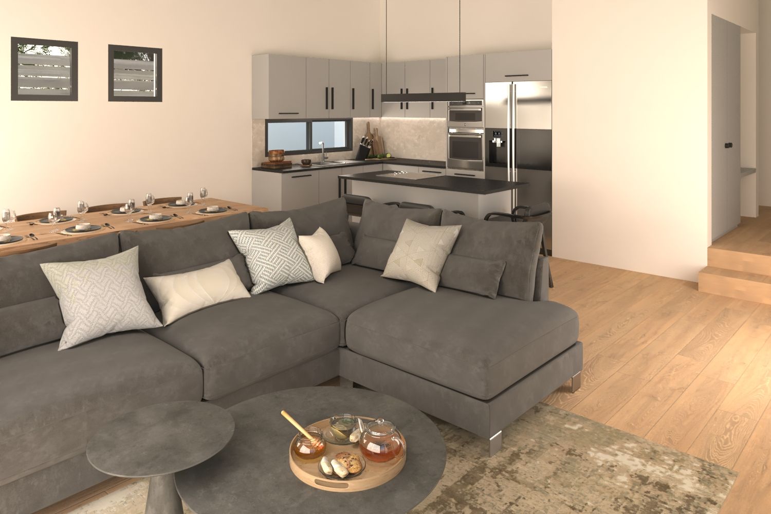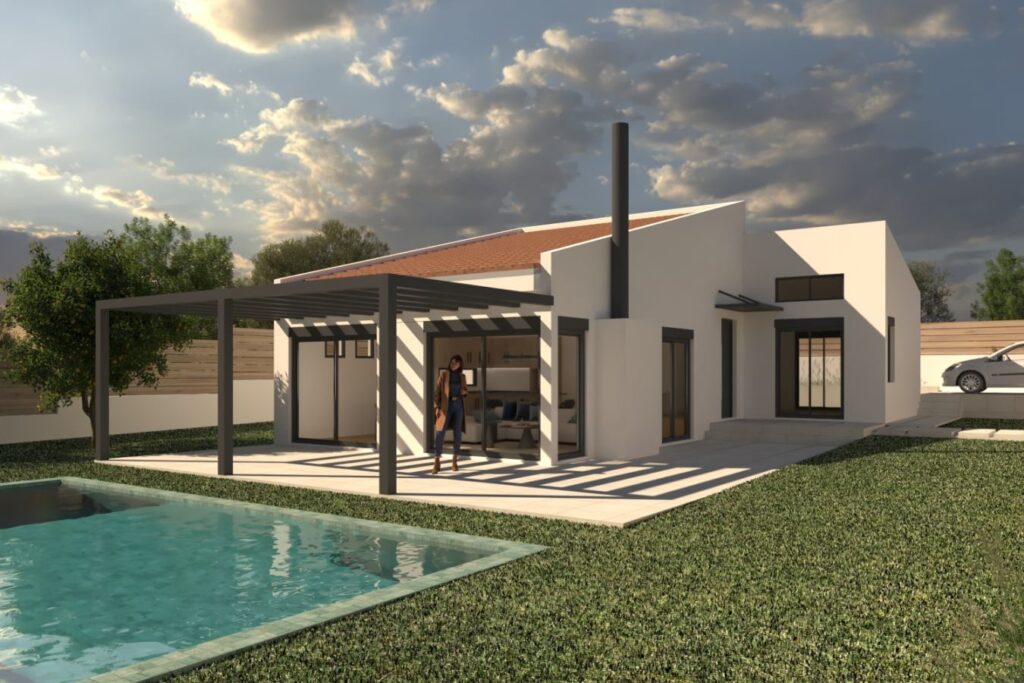Η κατοικία αποτελείται από έναν ενιαίο χώρο διημέρευσης που περιλαμβάνει καθιστικό/τραπεζαρία/ κουζίνα, τρία υπνοδωμάτια καθώς και δύο λουτρά. Το ζητούμενο του σχεδιασμού ήταν η ανάγκη για τη δημιουργία “ανοιχτών” εσωτερικών χώρων, με την έννοια της διαμπερότητας, για να υπάρχει άμεση πρόσβαση και οπτική επαφή με τον περιβάλλοντα χώρο του κήπου και της πισίνας. Όσον αφορά στον εσωτερικό σχεδιασμό της κατοικίας, σκοπός του σχεδιασμού ήταν η δημιουργία λιτών, άνετων και ζεστών χώρων.