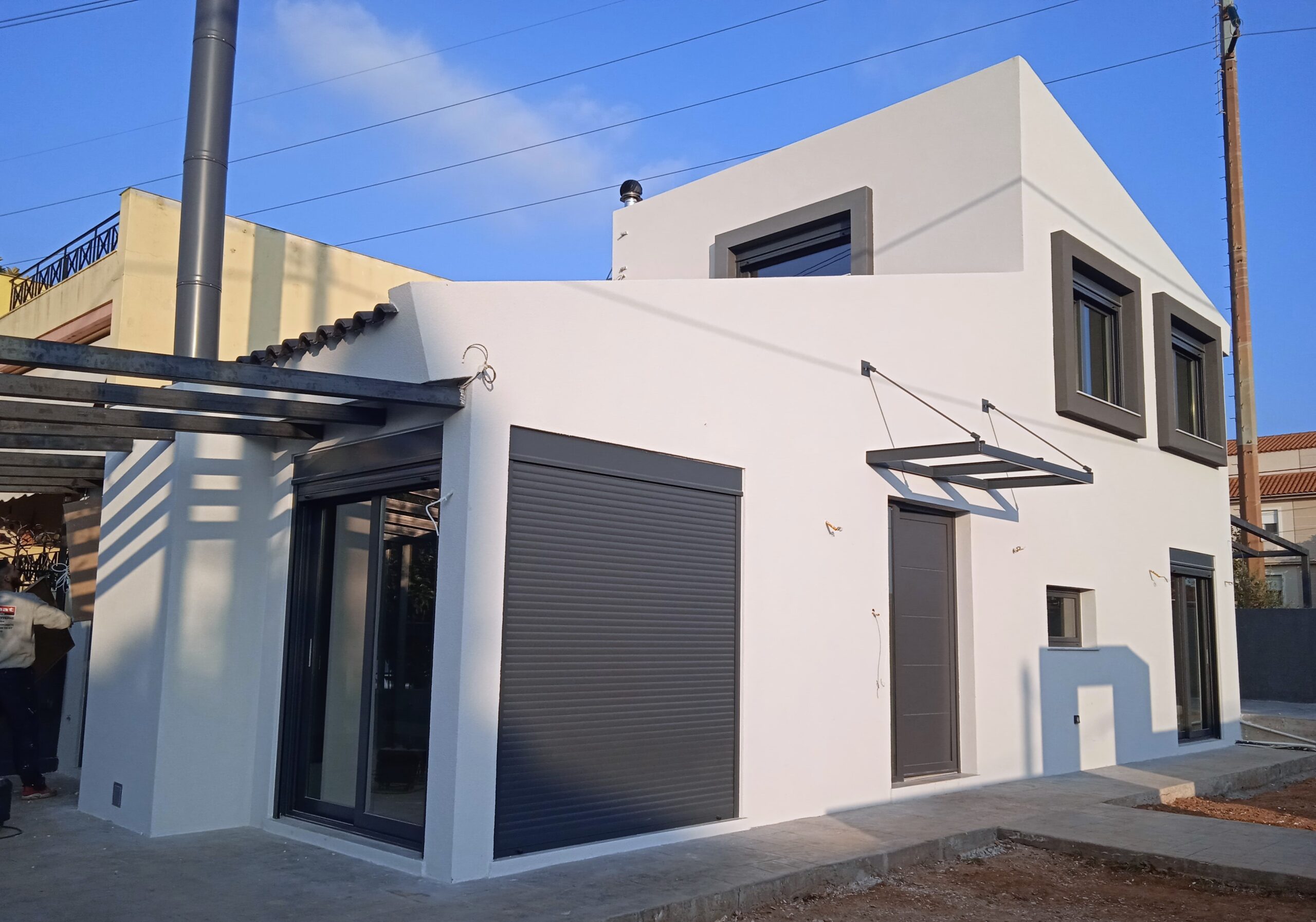 Διώροφη προκατασκευασμένη κατοικία, διαμορφωμένη σε δύο όγκους, έναν ισόγειο και έναν διώροφο, συνολικού εμβαδού 114 τ.μ. Η απλή και σύγχρονη γεωμετρική μορφή, οι λιτές γραμμές σχεδιασμού, η διατήρηση μονοχρωματικού προφίλ στο design, ο σχεδιασμός των χώρων με ευελιξία και ανθρωποκεντρικότητα, δημιούργησε μια σύγχρονη κατοικία, σεβόμενη τις ανάγκες και τις επιθυμίες των κατοίκων της.